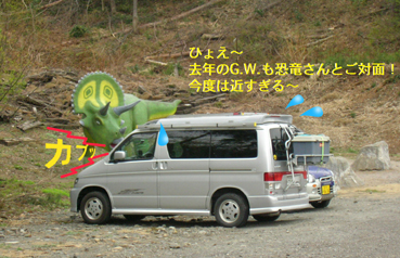 2006年のGW、我が家は今年はじめてのキャンプへ出掛けることに なりました。 去年のGWから全く動けなかったので、久しぶりのキャンプです。 それと、今回は次男のキャンプデビューでもあります。 目的地は我が家から適度な距離に位置する岐阜県は郡上八幡。 風情ある町並みを訪問する事に。 名神、東海北陸道を経由して自宅から2時間半ぐらいで 郡上I.C.に着きますが、空いている早朝の八幡市内を観光したいので いつもの様に自宅を深夜に出発。 郡上八幡I.C.の手前の瓢ヶ岳S.A.で軽く1時間半ほど仮眠休憩。